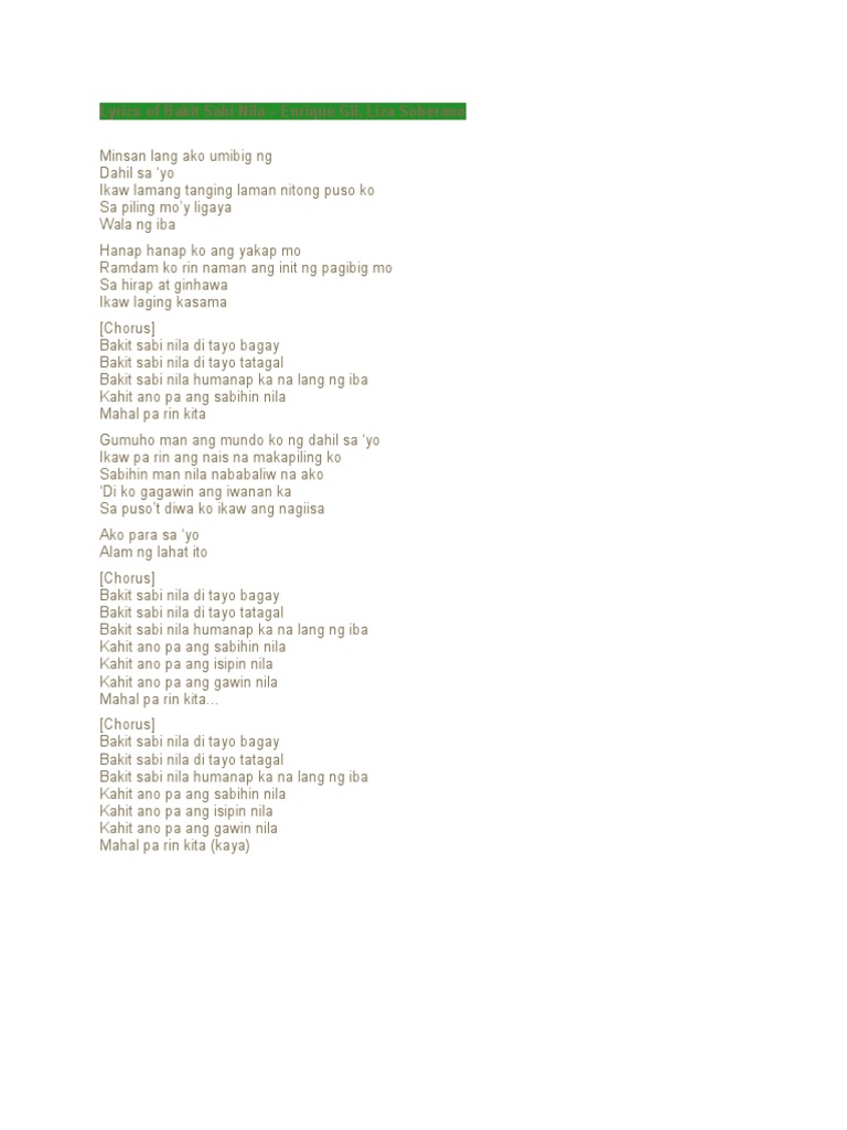 Bakit Sabi Nila Verse G Bb Minsan lang ako umibig na C Dahil sa yo G Bb Bm C Ikaw lamang tanging laman nitong puso ko Bm C Sa piling moy ligaya Bm C D Wala ng iba Bm C Hanap hanap ko ang yakap mo G C Ramdam ko rin naman ang init ng pagibig mo Bm C Sa hirap at ginhawa Bm C D Am Ikaw laging kasama Chorus D C G-Em Bakit sabi nila C Am Em. Bakit sabi nila di tayo bagay Bakit sabi nila di tayo tatagal Bakit sabi nila humanap ka na lang ng iba - PAUSE Kahit ano pa ang sabihin nila Mahal pa rin kita Gumuhong man ang mundo ko ng dahil sa yo Ikaw pa rin ang nais na makapiling ko Sabihin man nila nababaliw na ako Di ko gagawin ang iwanan ka Sa pusot diwa ikaw ay nagiisa Ako para.