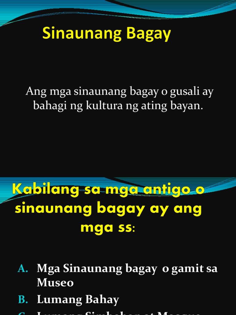 Mga bagay o kagamitang matatagpuan sa Pilipinas na tunay na nagtataglay ng kahalagahang pangkasaysayan pangkultural pansiyentipiko at pansining na may kinalaman sa ating kultura kasaysayan pinagmulan at kabihasnan bilang isang bansa. Kabilang dito ang mga mosque at ang simbahan mga lumang bahay pati na rin ang mga museo at ilang tanggapanMaglista ng limang sinaunang bagay o gusali na matatagpuan sa ating pamayanan. Kabilang ito sa tinatawag ng Fertile Crescent isang sinaunang rehiyon ng Asya na may matabang lupain at lumalandas mula Persian Gulf hanggang Mediterranean Sea Napaliligiran ang Fertile Crescent at Mesopotamia ng mga likas na hangganan.